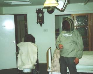 Paul back to the car and waiting till he removed his protective bee suit